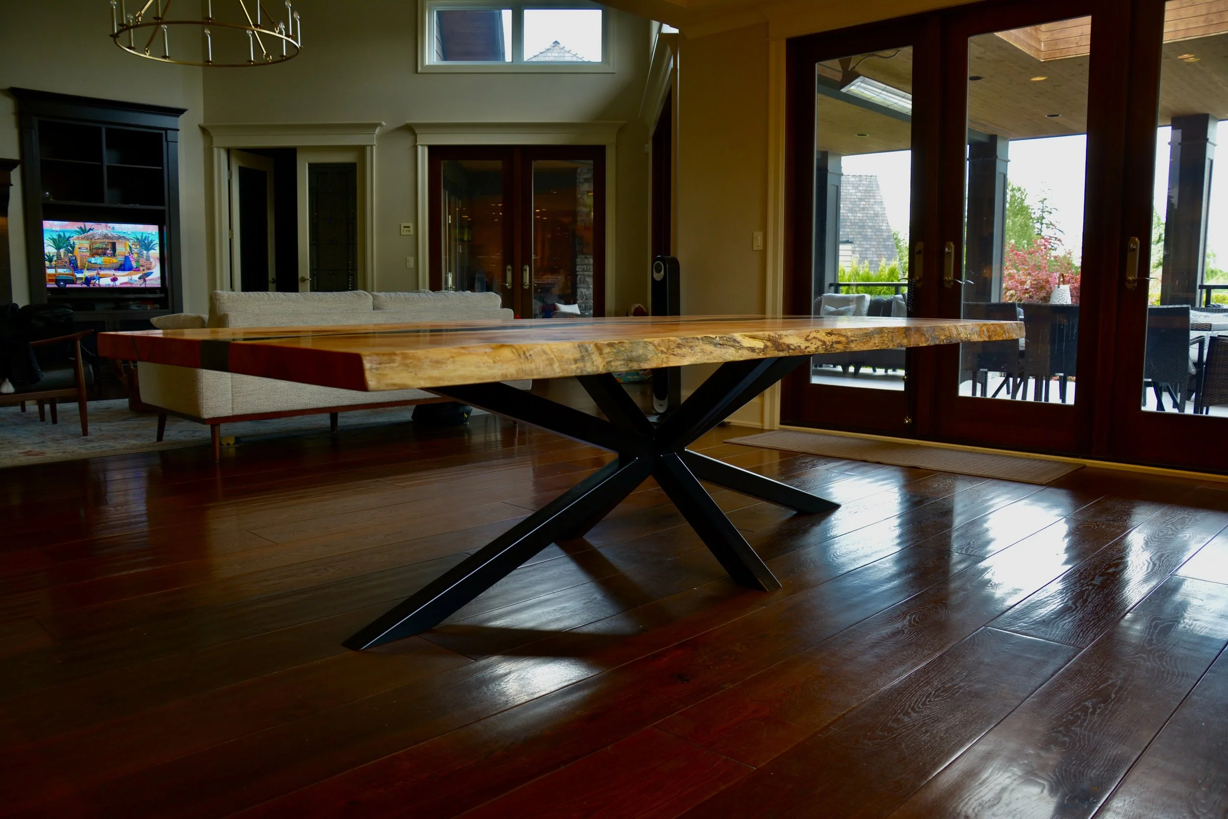 This piece is a striking live-edge river dining table with a bold, modern aesthetic. The tabletop is crafted from two bookmatched slabs of richly grained maple hardwood, showcasing warm golden-brown hues, flowing grain, and natural knots that highlight the character of the wood.