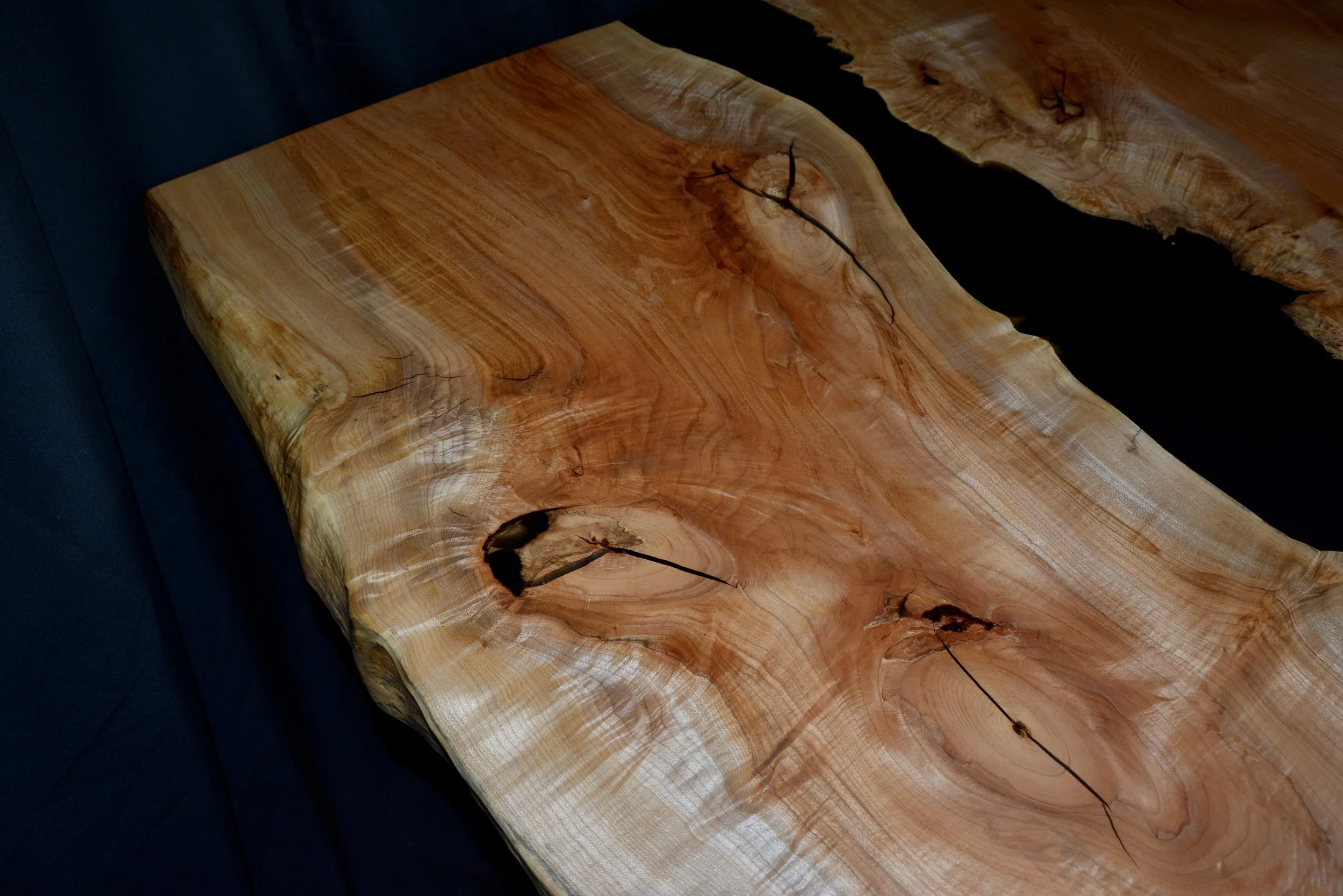 Running through the center is a deep black resin river, creating dramatic contrast with the lighter wood tones. The live edges of the slabs form the natural riverbank, giving the piece an organic flow while the glossy resin adds a sleek, contemporary touch.